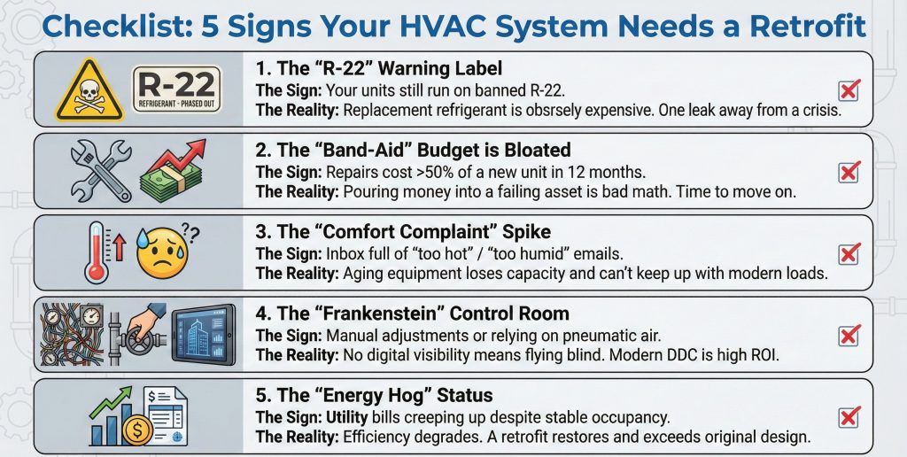 - Regulatory Compliance: Environmental regulations are tightening. From refrigerant phase-outs (like R-22 and now R-410a) to stricter emissions standards, older systems are becoming liabilities. A retrofit ensures you are compliant today and prepared for tomorrow.